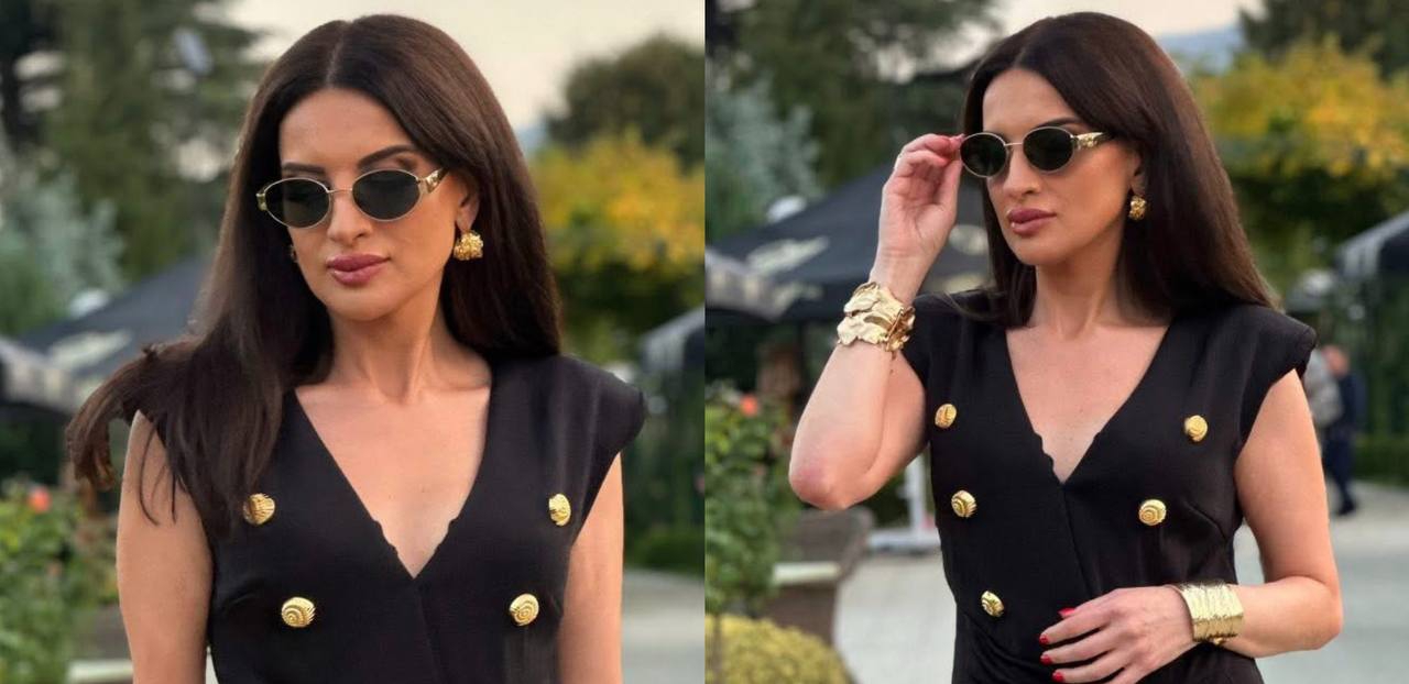 იგი ულამაზეს შავ კაბაში პოზირებს.